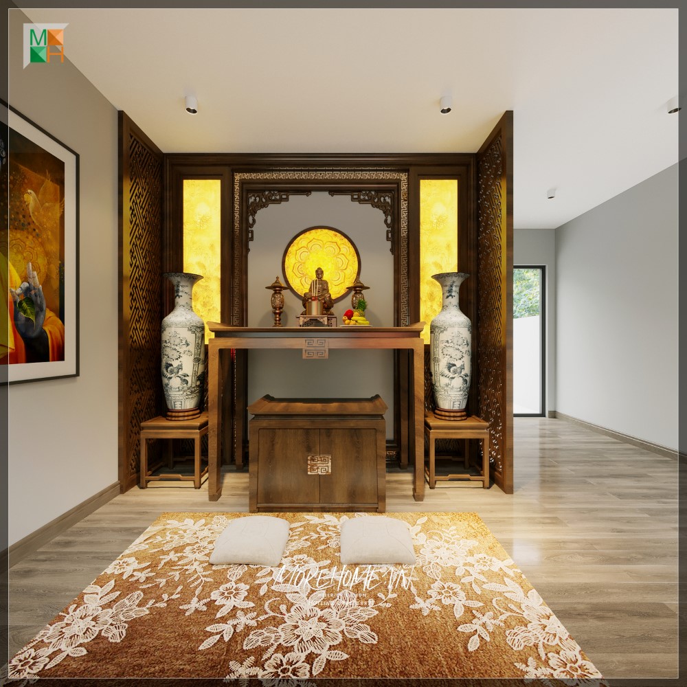 Bàn thờ gỗ óc chó nội thất linh thiêng nhất trong không gian, dâng những nén hương thơm đối với các bậc bề trên.
