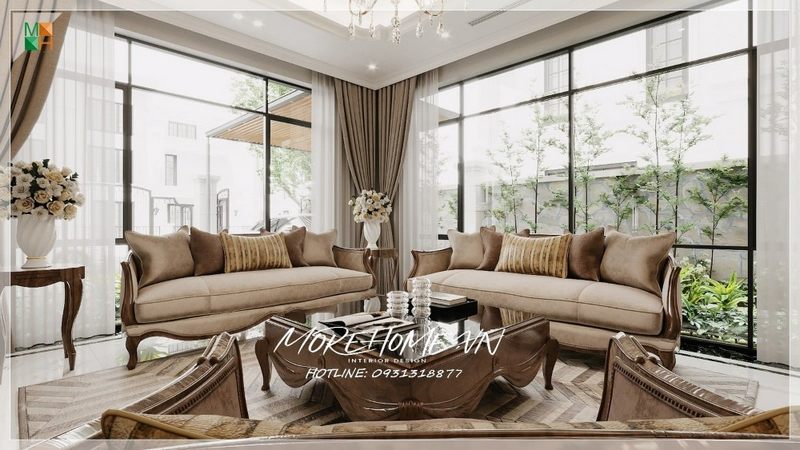 Bộ sofa đặc biệt với khung gỗ bằng gỗ óc chó tự nhiên cao cấp, kết hợp với đệm bọc nhung màu nâu êm ái sẽ làm nên sự hoàn hảo cho phòng khách biệt thự tân cổ điển.